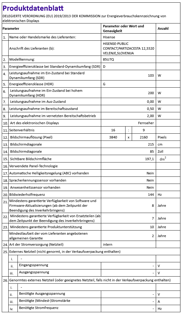 | Energieverbrauch (SDR) pro 1.000 Stunden | 103 kWh |