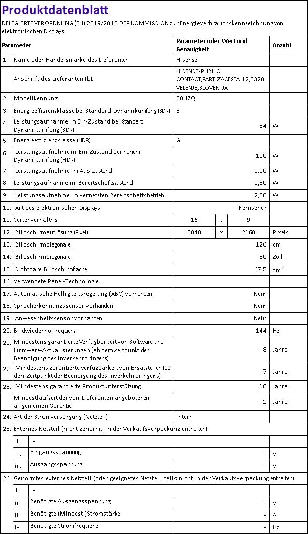 Über DVB-C Tuner, DVB-S2 Tuner und DVB-T2 Tuner empfängt der Hisense 50U7Q eine große Auswahl an Fernsehprogrammen. Anstatt jedes Mal die Fernbedienung suchen zu müssen, lässt sich dieses Modell kinderleicht per Smartphone und Tablet (mit entsprechender App) oder Sprachsteuerung bedienen. Der Hisense 50U7Q ist mit der Energieeffizienzklasse E ausgezeichnet.